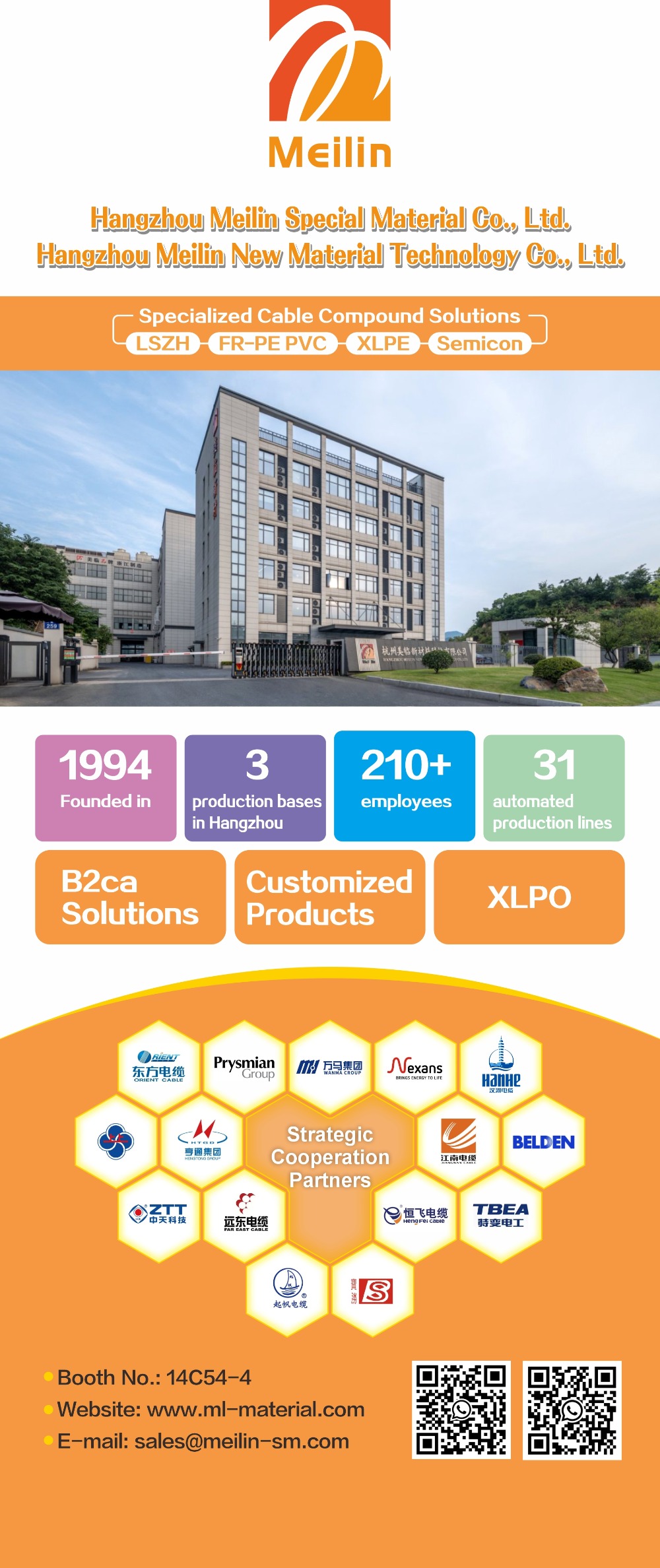 Founded in 1994, the company has over 30 years of experience in the cable material sector. In 2024, Hangzhou Meilin Special Material Co., Ltd. was established as part of the company’s strategic expansion. Today, the company operates three production bases equipped with 31 advanced automated production lines, with a total construction area exceeding 45,000 square meters. Its product portfolio includes LSZH, PVC, XLPE, SEMICON, SOLAR CABLE, and other series, which are widely used in power, telecommunications, new energy, and other fields. With strong manufacturing capabilities and consistent product quality, the company achieved an annual output value of over RMB 700 million in 2024, serving customers both domestically and internationally.